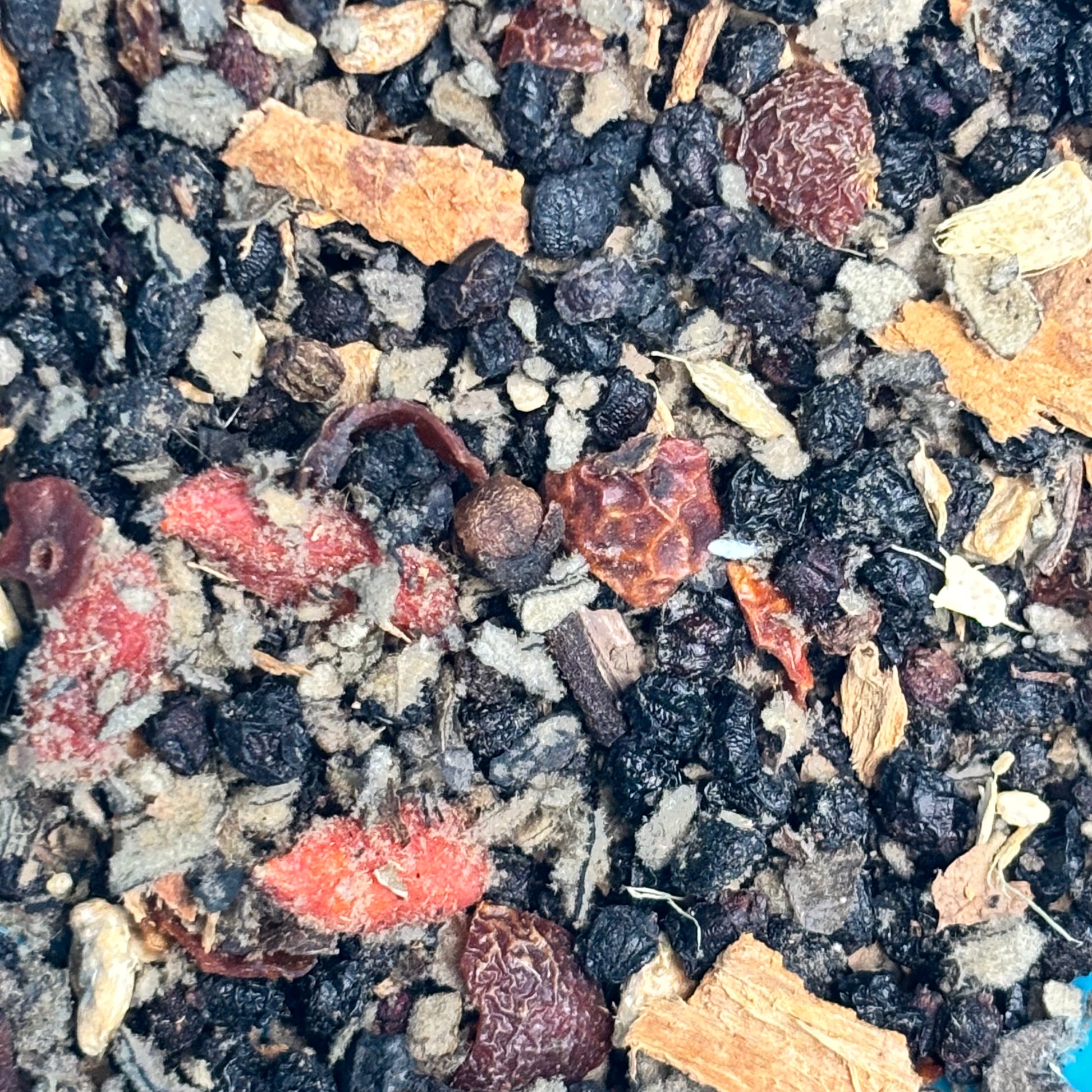 Ingredients : Elderberry, Ginger Root, Rosehip, Goji Berry, Mullein, Clove, Ceylon Cinnamon